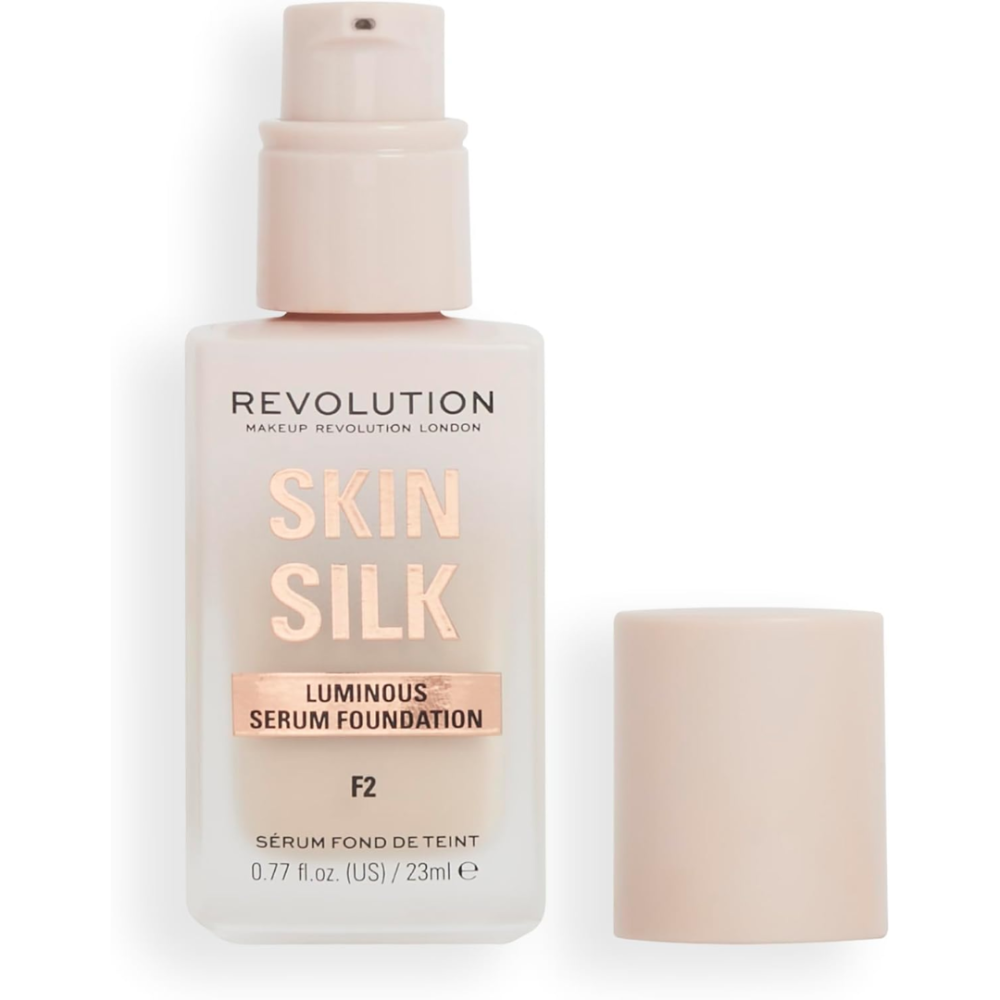 ريفوليوشن كريم اساس سيروم سكين سيلك بيوتي، تغطية خفيفة الى متوسطة، لمسة نهائية خفيفة الوزن ومشرقة، يحتوي على حمض الهيالورونيك، لون البشرة الفاتحة F2، 0.77 اونصة سائلة